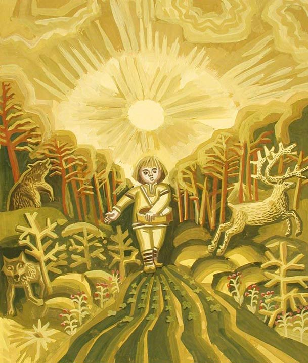 The longest myth involving Sämpsä is "Sämpsä's Awakening". It was sung during the Vakat festival, after spring sowing. A wealthy man named Ahti wanted his field to be more fertile and promised money as a reward to whoever can bring in Sämpsä. A wolf lusted after the money and went to look for Sämpsä, but Ahti disapproved of him as he had eaten Ahti's mother's ewe. Then the summer boy, who had no desire for riches, went to look for Sämpsä and found him on an island, telling him that Ahti wished for him to come and make the fields fertile. Sämpsä thanked the summer boy for when he had been looking for Sämpsä, he had already melted ice on lakes and rivers. He then went to sow Ahti's fields, and despite Ahti's wealth, "Ahti would sooner run out of land than Sämpsä out of seeds".