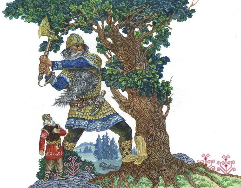 Descriptions of this figure vary. Usually, he is described as tiny, even called "small man from the sea" instead of black. In this case, he is described to be the height of a handspan, with a big black beard reaching to his knees, but his axe is massive, fit for a giant. With ease, he is able to cut down the oak.