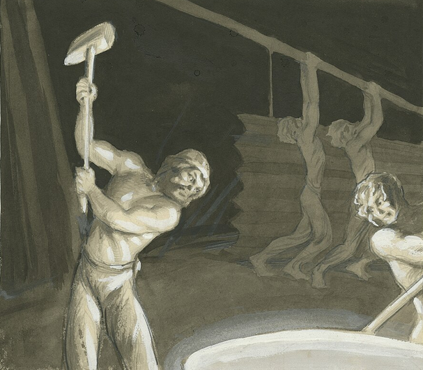 It's a bit unclear perhaps. :) This is the origin of the spear and the sword, in a way. Ilmarinen forged spears and then, due to Väinämöinen's request, also the sword. Väinämöinen's sword where "the Moon shines from the blade" is often referenced. Again, we see an instace where "slave" and "employee" are used as synonyms so who knows if that poor fella gets paid or not.